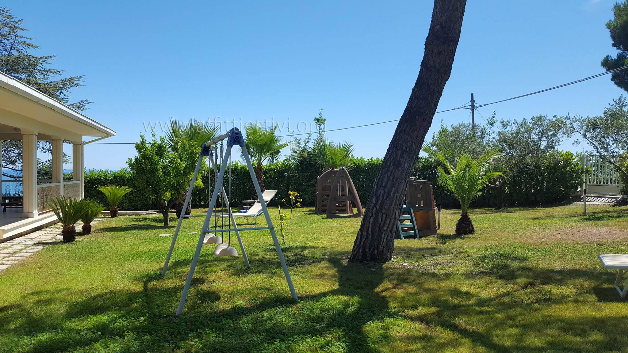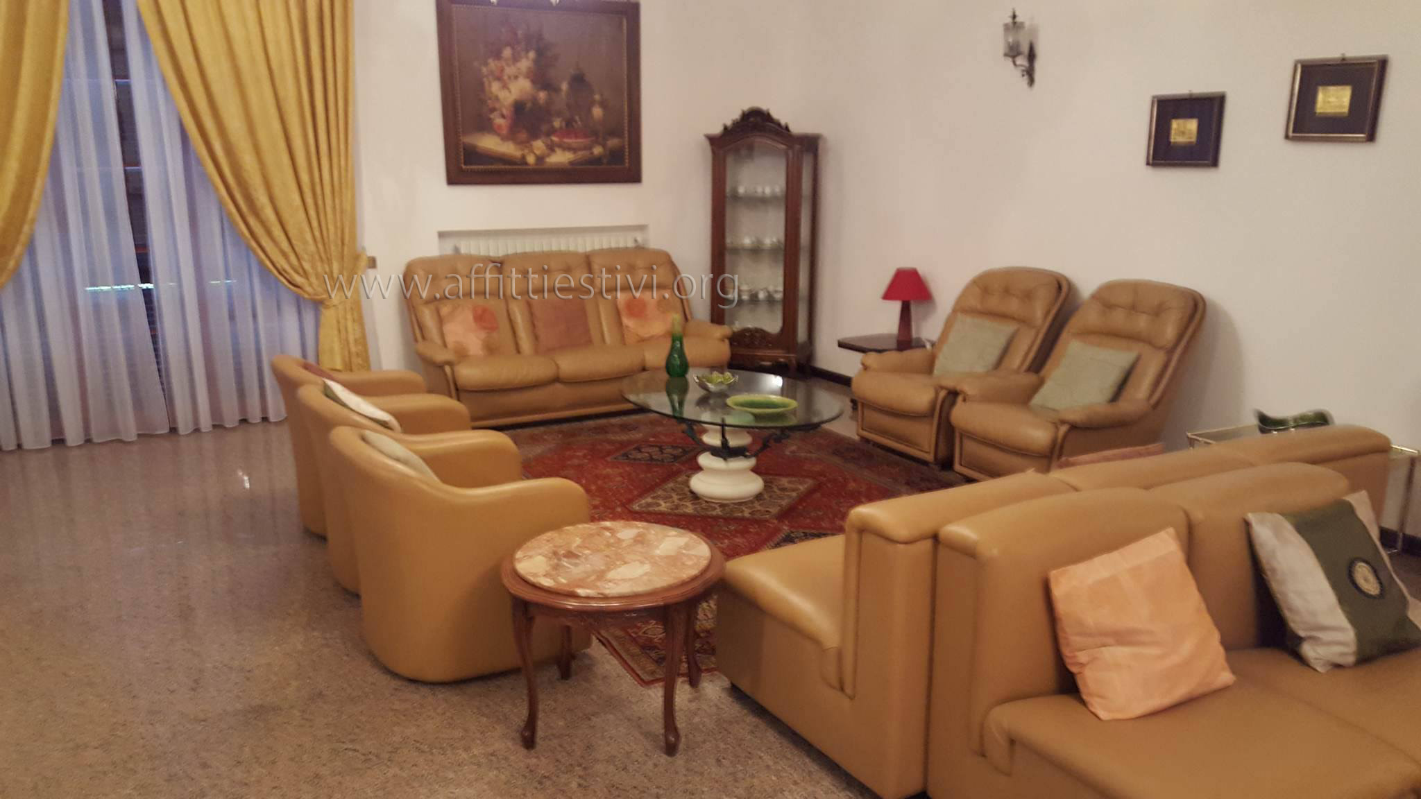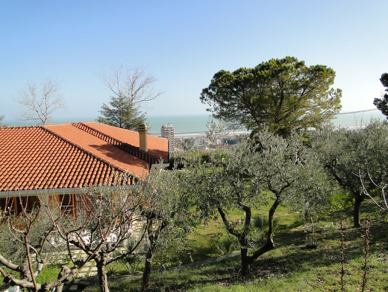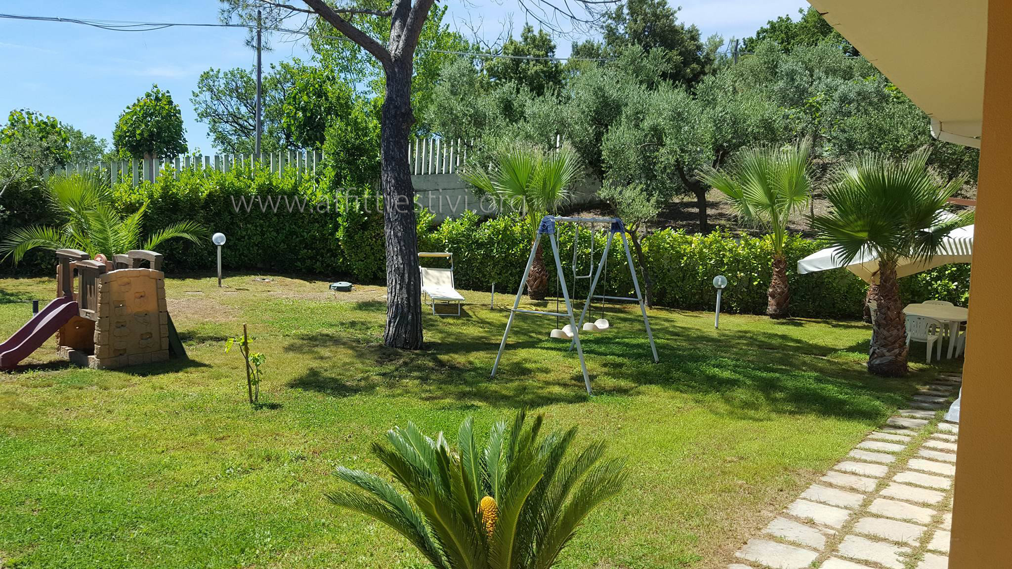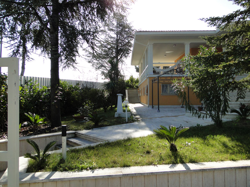 Fantastica Villa in affitto a Roseto, la struttura comprende esternamente: un grande parco con prato ed alberi, un piccolo uliveto collinare, una ampio parcheggio pavimentato, un garage, una terrazza arredata con vista panoramica sul mare e sulla città, balconi perimetrali, un gazebo, doccia e due fontane per l’acqua, un forno a legna, un barbecue in muratura con caminetto. Internamente la villa si divide in due piani: al primo piano c’è un grande salone con divani, poltrone e tavolini, una grande sala da pranzo con lato cucina all’americana: senza pareti divisorie; ben sei comode camere di cui due hanno il bagno con doccia annesso, altri due bagni in comune per un totale di 4. i posti letti complessivi, divisi nelle camere, sono 15, ma nel salone possono essere posizionati letti singoli supplementari e divani letto per un totale di circa 20 posti letto, Nel piano terra ci sono tre camere, che possono ospitare 7 posti letto, due bagni e una grande cucina-soggiorno per un totale complessivo ricettivo della villa di 20-22 persone. Vi sono tantissimi piatti, bicchieri, posate, stoviglie e utensili da cucina di ogni tipo, inoltre è dotata di due lavatrici e due lavastoviglie e due televisori. In tutte le stanze vi sono le ventole sul soffitto, ma essendo in posizione collinare non c’è mai un caldo afoso o esagerato, ma si gode di un caldo mitigato da ria fresca. Il mare è a meno di 1 Km. di distanza, il centro cittadino a circa 2 km. mentre negozi e servizi sono a 500 mt. La zona circostante è residenziale e molto silenziosa, costituita da tanto verde e ville signorili isolate, per cui è possibile protrarsi con eventuali party a base di grigliate, vino e musica fino a tarda notte senza dare fastidio al vicinato.